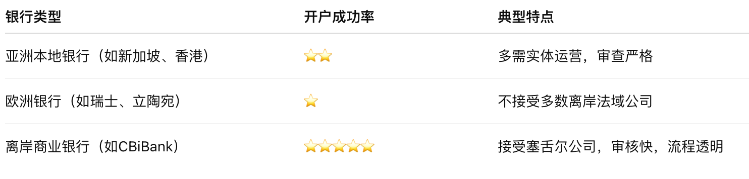 以下是塞舌尔公司在开户中常见的银行路径,但成功率差距巨大: