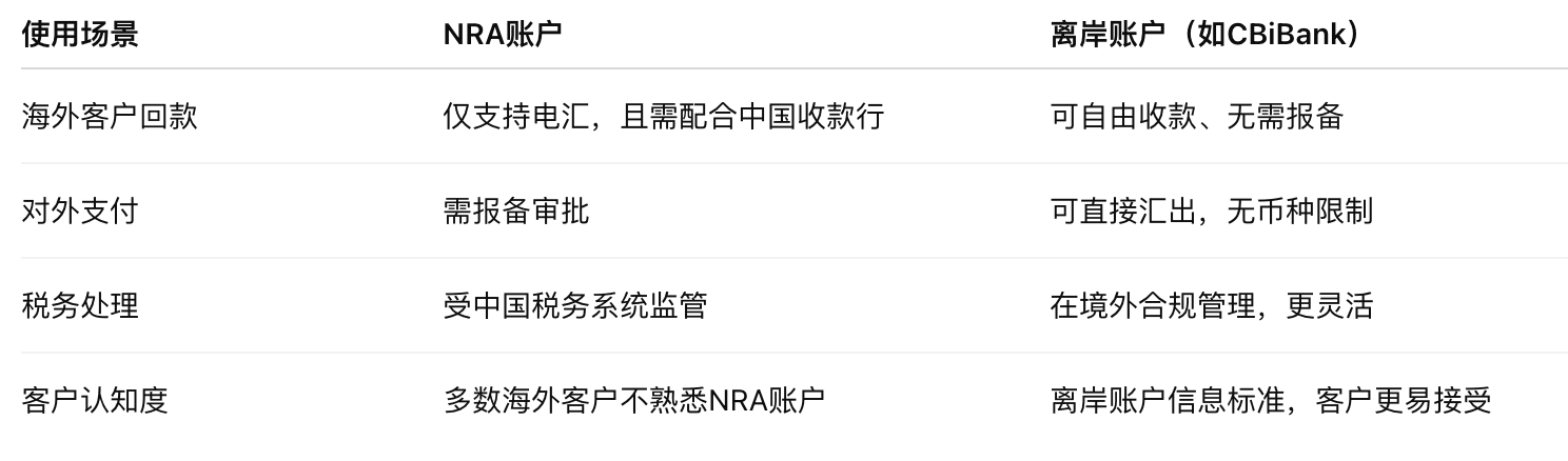 NRA账户适合本地监管下的收付合规操作,而离岸账户,尤其是CBiBank这类美国商业银行账户,则更适合支撑多币种、多地区的灵活交易。
