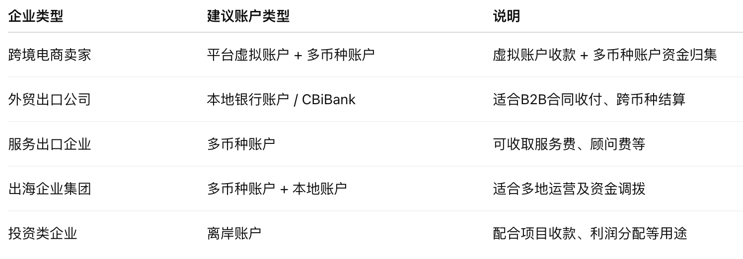 这类账户介于传统银行与平台账户之间,属于企业专属账户,由国际商业银行提供服务,支持多币种收付和多种用途,适合贸易、服务、电商多场景使用。