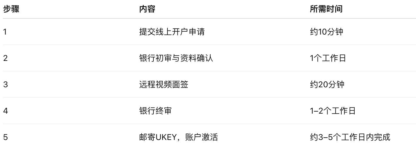 一般情况下,CBiBank的企业账户1–3个工作日即可完成开户。