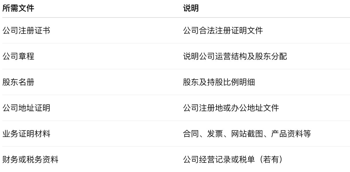需提供公司法人及主要股东的身份证件或护照信息,用于银行KYC(身份识别)审查。